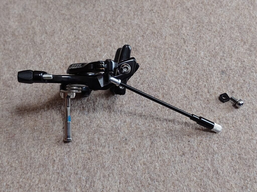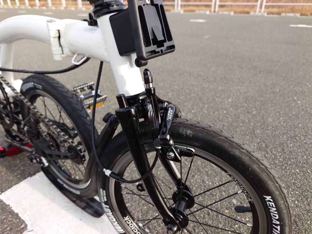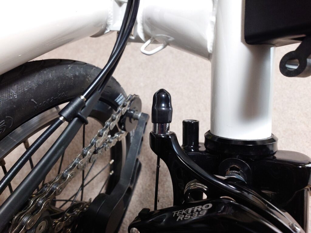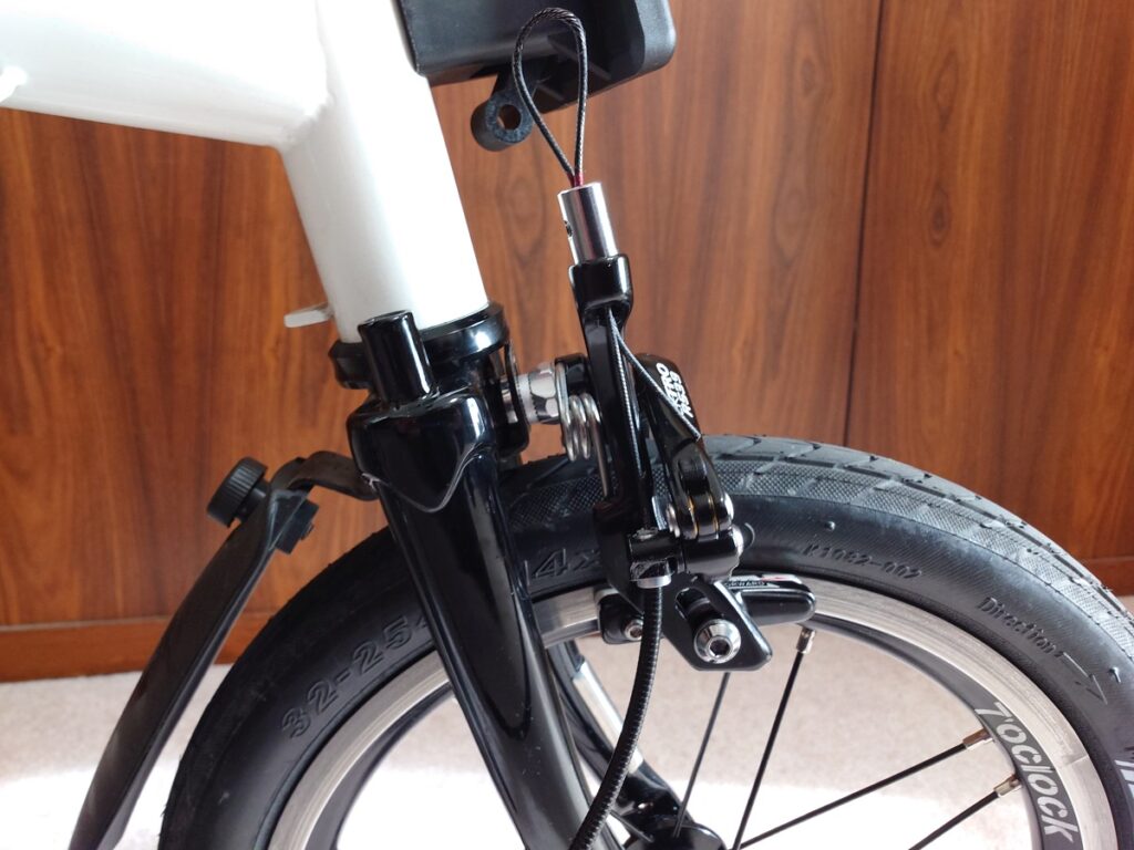 一応、交換のメリットはブレーキリリース機能が付いているので、タイヤの空気を抜かずにホイールを外せる事。あとは折り畳み時にリアブレーキケーブルがチェーンリングに噛みこむので、リア側はケーブルルートを変える目的に使えるぐらいかな。