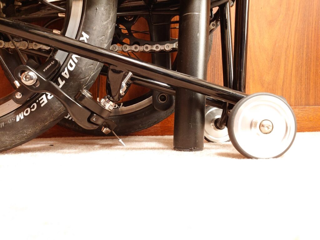 リアの泥除けにはキャスターが付いているので、外してしまうと折り畳み時のバランスが取れなくなりますが、オプションのリアキャリアを付ければバランスが取れそうです。