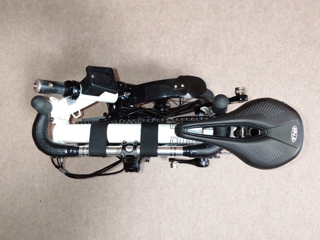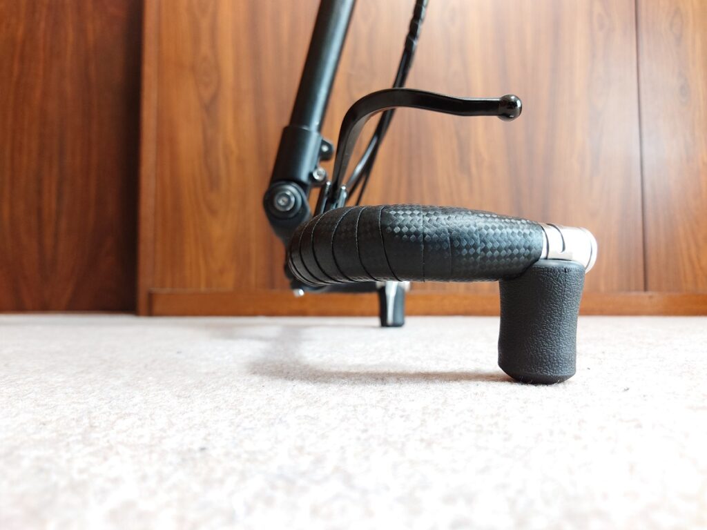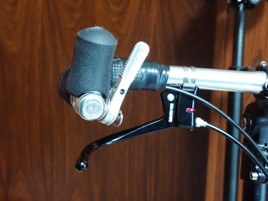 ギドネットレバーとハンドレストに取付けたシフターは操作できる程度の物で、試走を繰り返しても馴染む事はなく、逆にブレーキレバーの指の掛かりが悪く、少しずらした握り方をした影響で親指の付け根辺りが痛むようになりました。本来ならギドネットレバーの配置を変えて握りやすく出来るハズですが、折り畳み時にハンドルバーとブレーキレバーの間にメインフレームが収まるようになっていて、これ以上の調整が出来ない状態です。