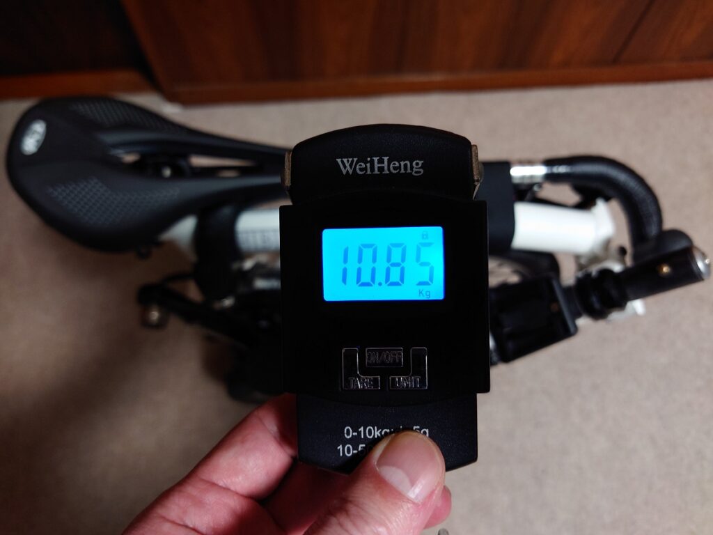 ペダル無し重量で約10.9kgで1.2kgほど増えています。主にスピードドライブ化とリアキャリアの取り付けでの重量増加です。