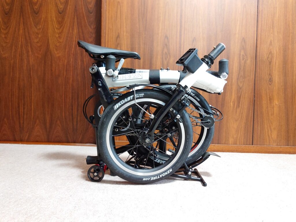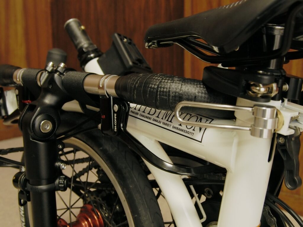 当初は下引きキャリパーブレーキ化で純正フェンダーを外した影響で、折りたたみの固定が上手くいかずいろいろ検討していましたが、純正ブレーキに直した事でハンドルポスト以外の折り畳みについてはBrompton特有の折り畳み方法に戻っています。