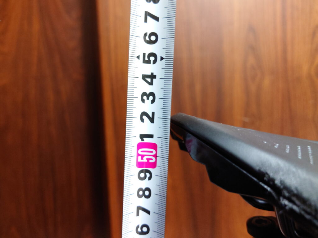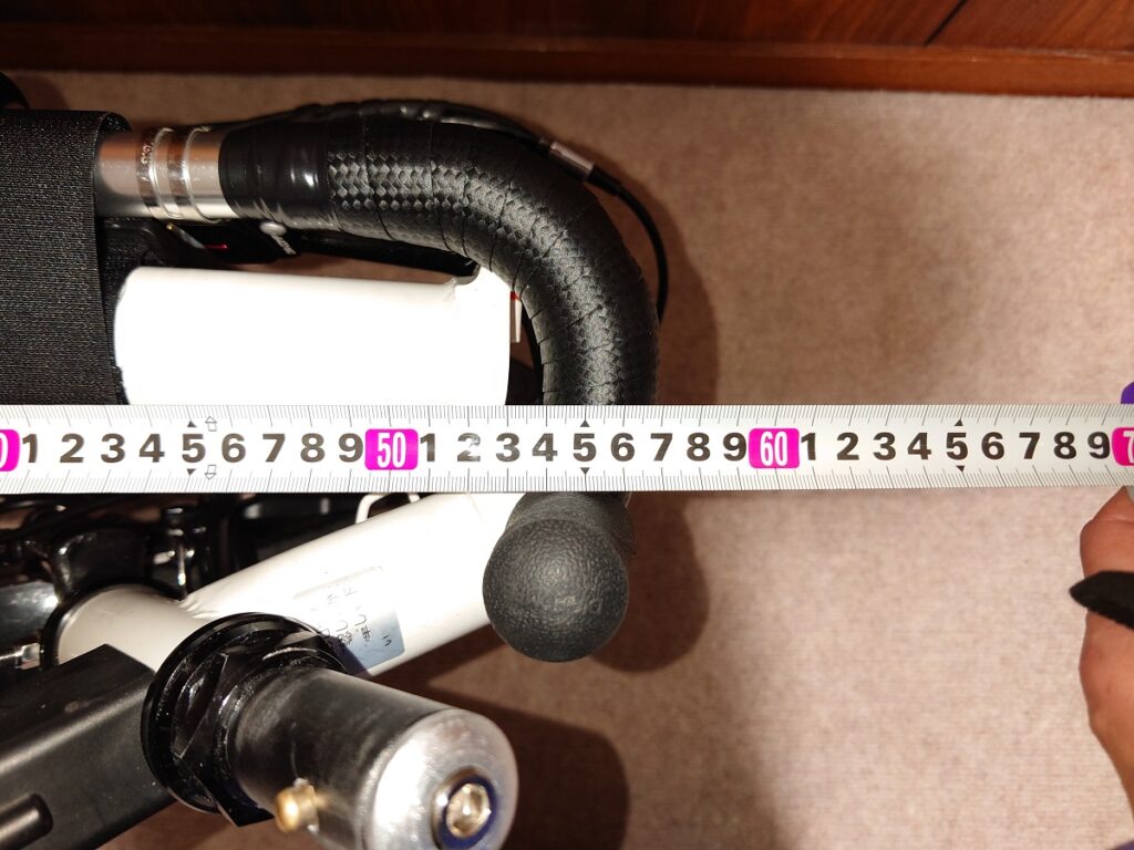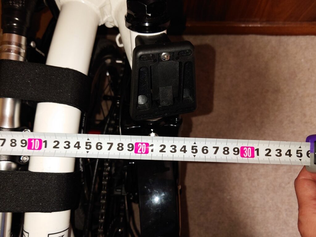 クランク端からキャリアブロックの端までが25cmで、今回のカスタムの本題のハンドルポストの配置換えの影響です。改造前はEzy Superiorのアダプター無しで測定していたので、同じ条件にするなら更に1.5㎝小さい23.5cmになります。