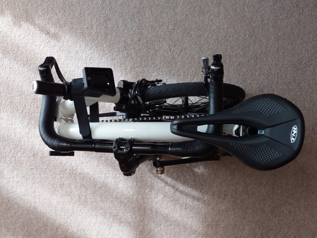 地面からサドルの端までが52.5cmで変わってない感じですが、折り畳み時の安定化のためにBronpton用に販売されているイージーホイールエクステンションロッドを付けてイージーホイールも大型化しています。本来は高くなるハズですが、サドル固定のペンタクリップを上下逆に入れ替えて、折り畳み時にサドルが下がるように細工しています。Bronptonユーザーが良くやっているので、折り畳みサイズを小さくする定番の方法っぽいです。